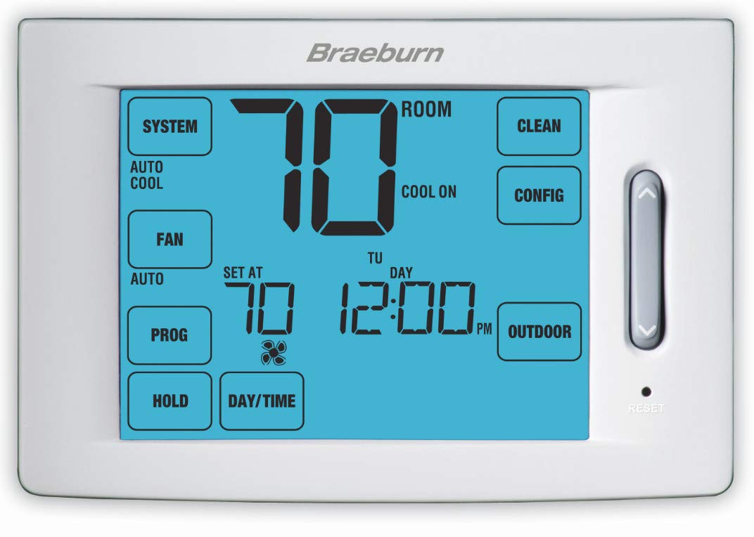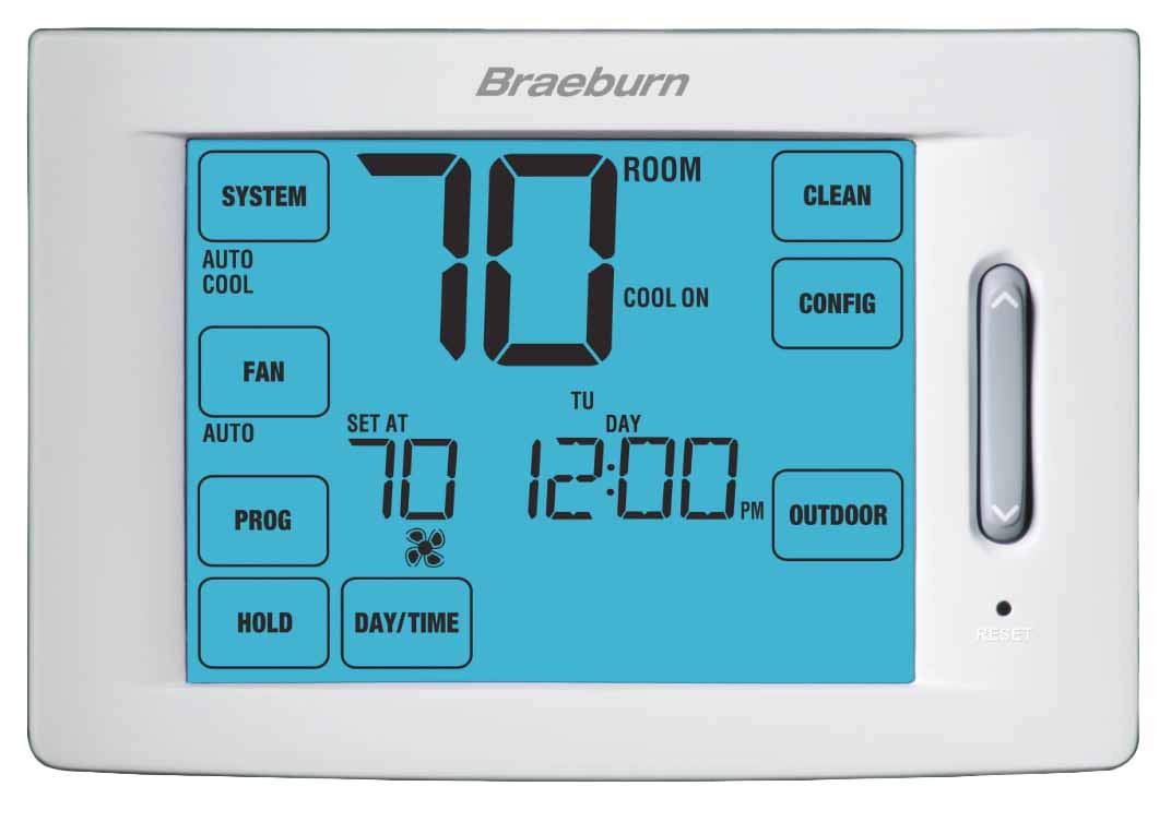 7 day, 5-2 day or non-programmable, large 12 sq. In. Easy-read touchscreen , auto or manual changeover Bright blue backlight display, exclusive speed bar technology , adjustable temperature limits ,indoor or outdoor remote sensing Speed set programming mode, user selectable service monitors , separate user and installer reset buttons Hardwire or battery power, multi-level keypad lockout , circulating Fan mode Programmable Fan mode, meets California title 24 guidelines